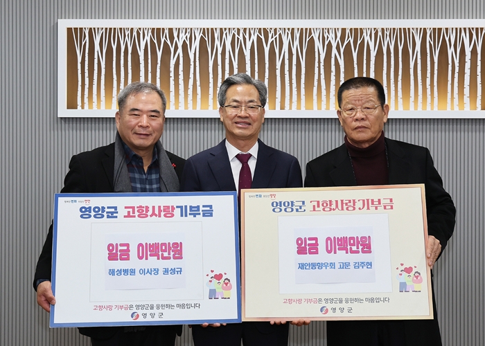 [시사코리아저널=김연학 기자] 영양군(군수 오도창)은 권성규 봉화 해성병원 이사장과 김주현 재안동향우회 고문이 24일 영양군청을 방문하여 고향사랑기부금을 각각 200만원씩 기탁했다고 밝혔다.