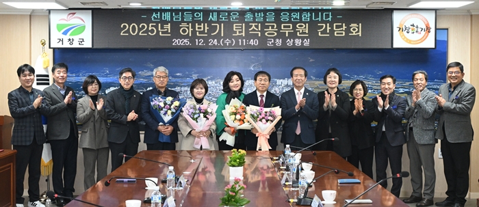 [시사코리아저널=정종민 선임기자] 거창군은 지난 24일 군청 상황실에서 퇴직을 앞둔 공무원들의 공직생활의 노고와 헌신에 대한 감사를 전하기 위해 ‘2025년 하반기 퇴직공무원 간담회’를 개최했다.