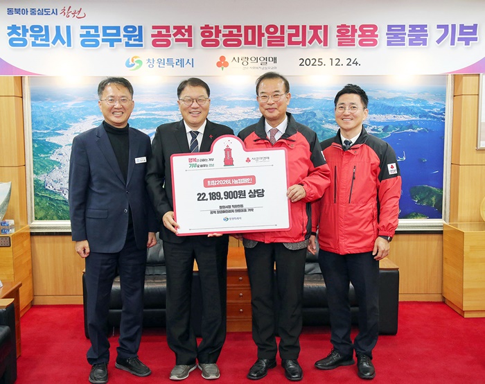 [시사코리아저널=정종민 선임기자] 창원시는 24일 시청 접견실에서 장금용 시장 권한대행과 강기철 경남사회복지공동모금회장을 비롯한 관계자 등이 참석한 가운데 공적 항공마일리지를 활용한 생활용품 전달식을 개최했다.