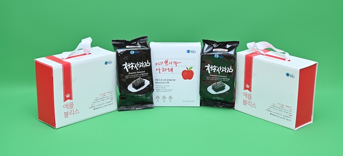 ‘청송사과김’은 ‘풋사과 소금 및 이의 제조방법’ 특허 기술을 적용한 제품으로, 2025년 6월 한국맥꾸룸과의 기술이전 협약을 통해 생산된 풋사과소금을 사용해 제조됐다. 사과 특유의 산뜻한 풍미와 감칠맛이 특징이며, 가격은 1박스(12봉) 2만 원이다.