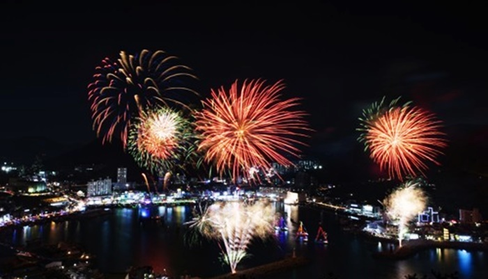 장승포항 밤하늘을 화려하게 수놓는 해상 불꽃놀이가 축제 하이라이트다.