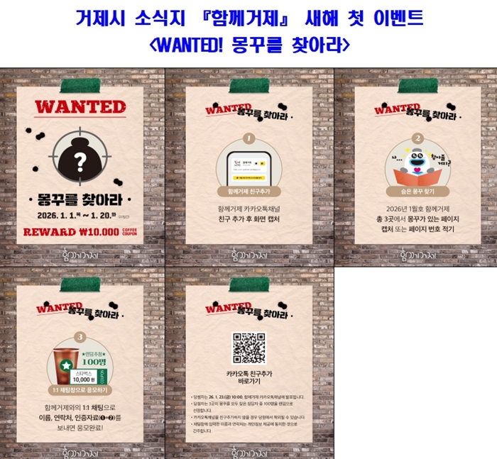 [시사코리아저널=정종민 선임기자] 거제시 시정소식지 ‘함께거제’가 2026년 새해를 맞아 시민이 자연스럽게 시정홍보 콘텐츠를 접하고 즐길 수 있도록, 구독 참여를 유도하는 특별 이벤트 'WANTED! 몽꾸를 찾아라'를 1월 1일부터 20일까지 20일간 진행한다.