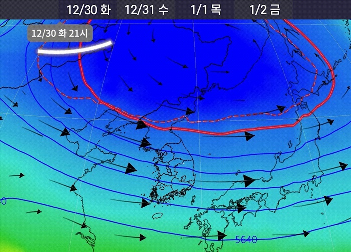 | 12월 30일부터 내년 1월 2일까지 한반도 주변 대기 상층 기온 변화. /기상청 제공 |