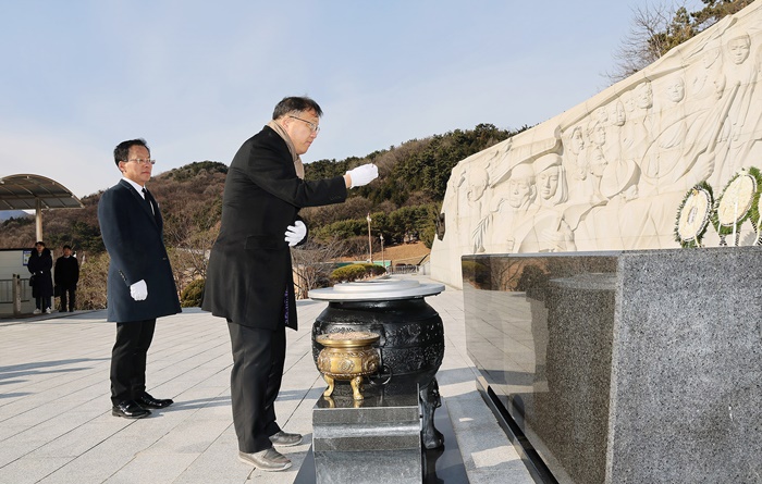 | 장금용 창원시장 권한대행이 1일 국립 3·15민주묘지를 참배하고 있다. |