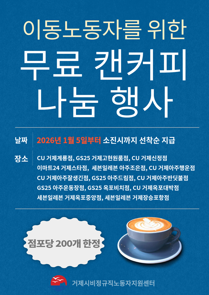 [시사코리아저널=정종민 선임기자] 거제시비정규직노동자지원센터는 거제시와 함께 지난 혹서기 이동노동자 생수 나눔 지원사업에 이어 이동노동자 간이쉼터 상생협약을 체결한 관내 14개소 편의점(CU 거제신정점, CU 거제계룡점, GS25 거제고현원룸점, 이마트24 거제스타점, CU 거제아주행운점, CU 거제아주잘생긴점, CU 거제아주반딧불점, 세븐일레븐 아주조은점, GS25 아주드림점, GS25 아주운동장점, GS25 옥포비치점, CU 거제옥포대박점, 세븐일레븐 거제옥포중앙점, 세븐일레븐 거제장승포항점)에서 이동노동자를 위한 캔커피 나눔 사업을 진행한다.