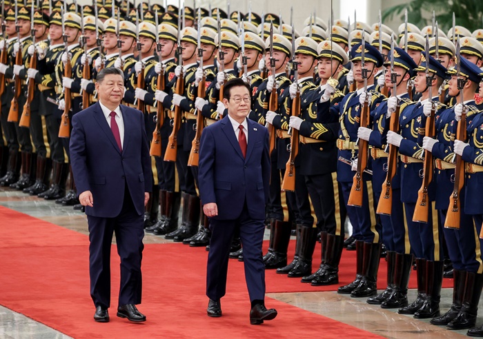 | 이재명 대통령과 시진핑 중국 국가주석이 5일 베이징 인민대회당에서 열린 이 대통령 공식환영식에서 의장대를 사열하고 있다. /연합뉴스 |