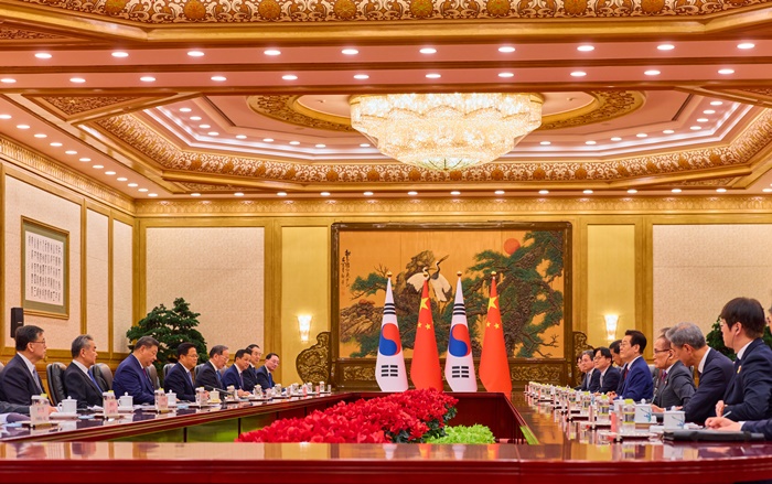 | 이재명 대통령이 5일 베이징 인민대회당에서 시진핑 중국 국가주석과 한중 정상회담을 하고 있다. /공동취재 제공 |