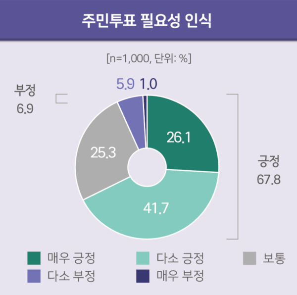 또한, 대전 시민들은 행정통합 여부는 주민투표로 결정해야 한다고 판단했다. ‘주민투표 필요성’을 묻는 항목에서 긍정 67.8%, 부정 6.9%, 보통 25.3%로 각각 응답했다. 이밖에 설명회·토론회·온라인 의견제출 등 ‘공론화 활동에 참여 의향’에 대해서는 긍정 37.8%, 부정 19.1%, 보통 43.1%로 답변했다.