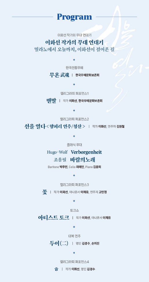 17년 캘리그라피 작가로서 첫 콘서트를 준비 중인 이화선 작가는 “선을 개척해 온 여정에 힘을 얻어 세월이 흘러 백발이 성성한 모습이 되어서도, 무르익은 한글의 아름다움을 전하고 싶다"면서 "살아있는 언어, 살리는 글씨를 온 세상에 피워내기 위한 사명을 펼칠 무대에 함께 해주시기 바란다”고 전했다.