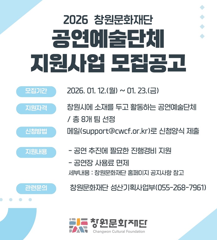 [시사코리아저널=정종민 선임기자] 재단법인 창원문화재단(대표이사 직무대행 최춘환)은 창원지역 공연예술단체의 창의적 활동을 안정적으로 지원하고, 다채로운 예술프로그램을 시민과 함께 향유하기 위해 ‘2026 공연예술단체 지원사업’에 참여할 우수 공연예술단체를 이달 12일부터 23일까지 모집한다.