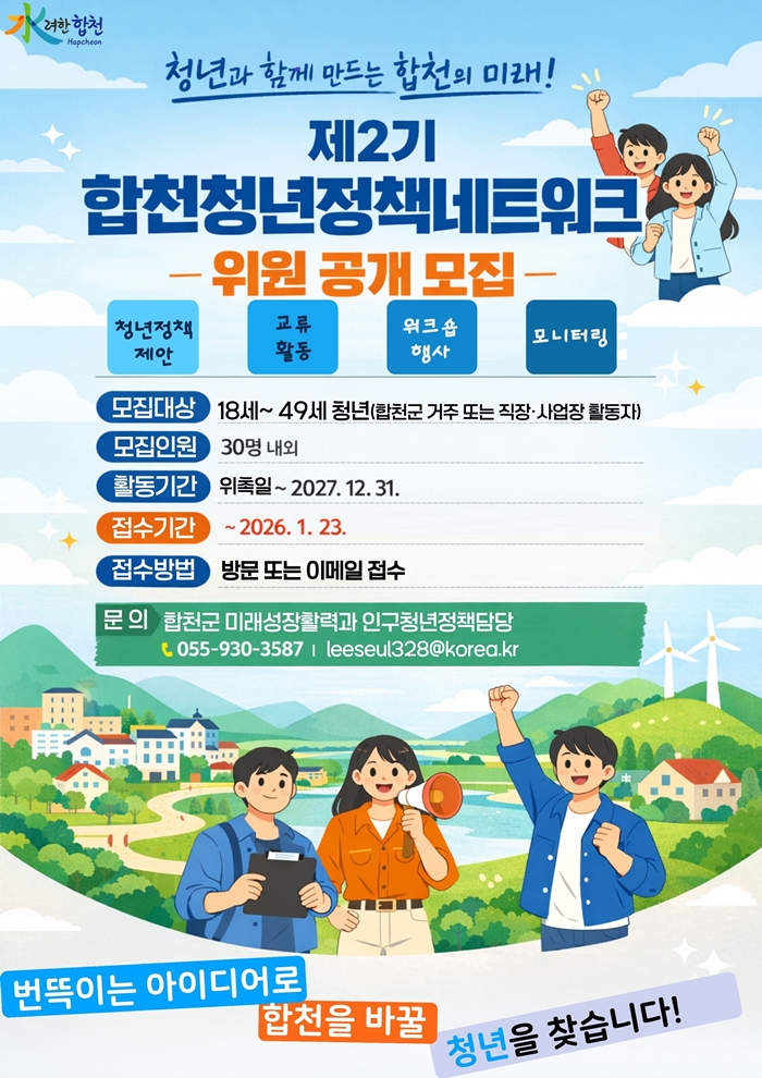 [시사코리아저널=정종민 선임기자] 합천군은 청년들의 다양한 목소리를 군정에 반영하고 청년정책 추진을 위한 소통 창구를 강화하기 위해 제2기 ‘합천청년정책네트워크’ 위원을 1월 23일까지 공개 모집한다고 8일 밝혔다.