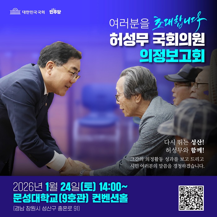 [시사코리아저널=정종민 선임기자] 더불어민주당 허성무 국회의원(창원 성산구, 산업통상자원중소벤처기업위원회)은 24일 오후 2시 창원문성대학교 9호관에서 의정보고회를 개최한다고 21일 밝혔다.