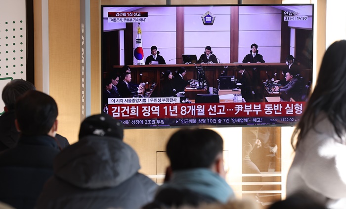 | 김건희 여사의 자본시장법·정치자금법 위반, 특정범죄 가중처벌법상 알선수재 혐의 사건의 선고 공판이 열린 28일 서울 용산구 서울역 대합실에서 시민들이 관련 뉴스를 지켜보고 있다. /연합뉴스 |