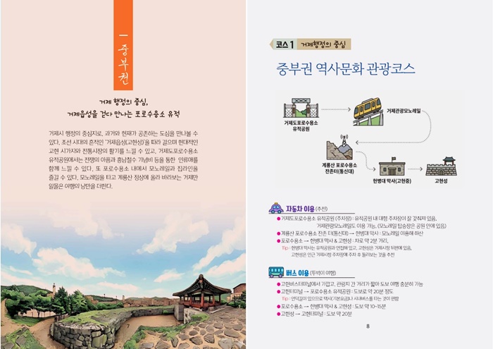 ‘관광코스’ 편에서는 거제를 권역별로 구분해 역사와 문화가 어우러진 관광 동선을 제안하고, 코스별 이동 경로와 주요 관광지에 대한 설명을 함께 담아 개별 여행객은 물론 가족 단위 관광객도 거제의 역사 관광을 효율적으로 즐길 수 있도록 했다.