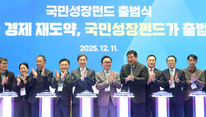 | 지난해 12월 11일 서울 여의도 산업은행에서 열린 국민성장펀드 출범식에서 박상진 한국산업은행 회장(왼쪽 네번째부터), 이억원 금융위원장과 박현주 미래에셋 회장, 서정진 셀트리온 회장 등이 기념 세리머니를 하고 있다. /연합뉴스 자료사진 |