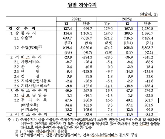 한국은행이 6일 발표한 국제수지 잠정 통계에 따르면 지난해 12월 경상수지는 187억달러(약 27조5천억원) 흑자로 집계됐다. 월간 기준으로 사상 가장 많다.