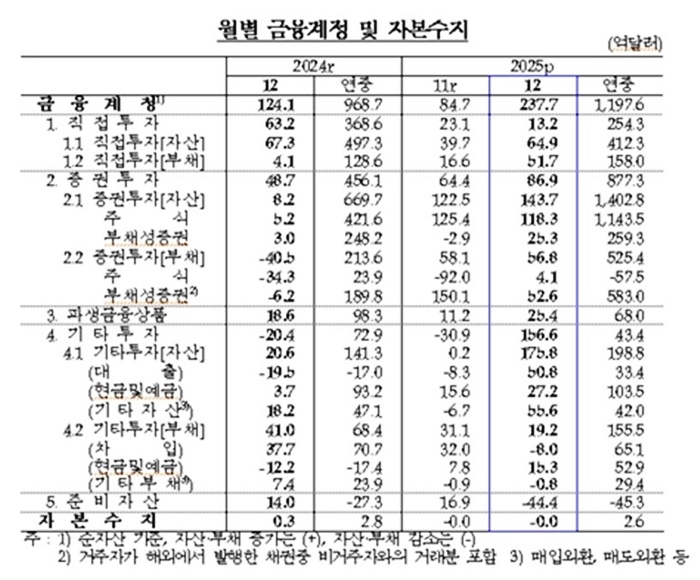 금융계정 순자산(자산-부채)은 12월 중 237억7천만달러 불었다.