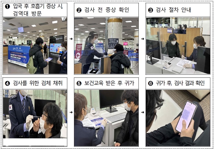 이에 따라 기침 등 호흡기 감염병 증상이 있는 입국자는 검사를 희망할 경우 검역소 검역대, 해외 감염병 신고 센터 등에서 검사를 받을 수 있다.