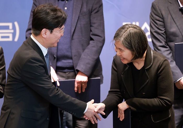 | 김영훈 고용노동부 장관(왼쪽)과 장지연 퇴직연금 기능 강화를 위한 노사정 테스크포스(TF) 위원장이 6일 서울 여의도 켄싱턴호텔에서 퇴직연금 기능 강화를 위한 노사정 TF 공동선언문 발표식 기념 촬영을 마친 뒤 인사하고 있다. /연합뉴스 |