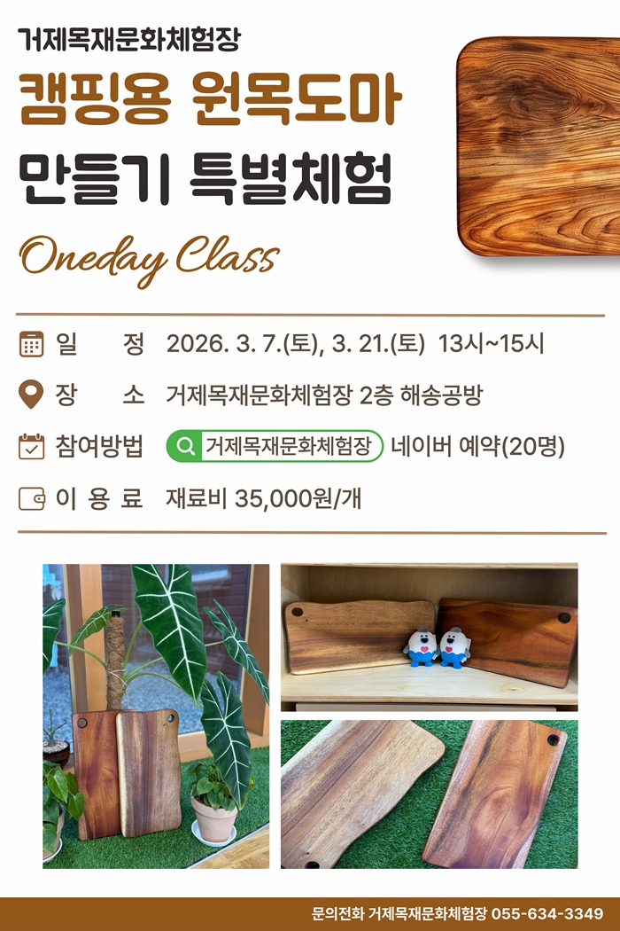 [시사코리아저널=정종민 선임기자] 거제목재문화체험장은 오는 3월 7일(토)과 3월 21일(토), 성인 방문객을 대상으로 한 원데이클래스 프로그램 '캠핑용 원목도마 만들기 특별체험'을 운영한다고 밝혔다.