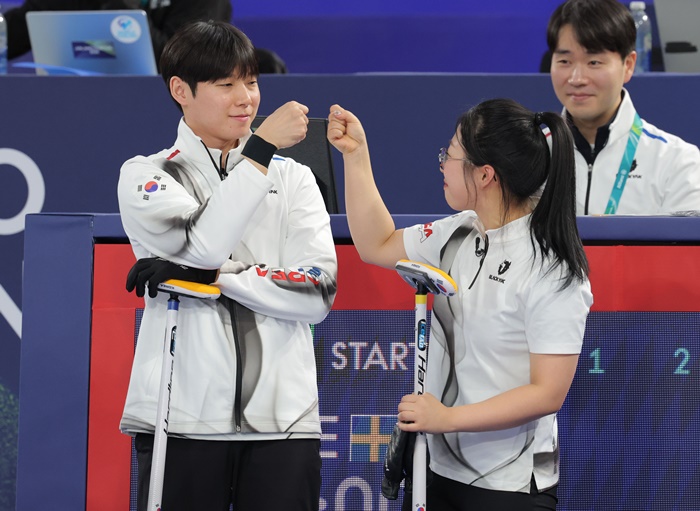 | 컬링 믹스더블 국가대표 김선영과 정영석이 4일(현지시간) 이탈리아 코르티나담페초 컬링 올림픽 스타디움에서 열린 밀라노·코르티나 동계올림픽 스웨덴과의 라운드로빈 경기 시작 전 주먹을 맞대고 있다. /연합뉴스 |