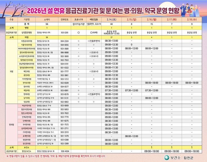 응급환자 발생에 대비해 지역응급의료기관인 삼성합천병원은 설 연휴 동안 24시간 응급실을 운영하며, 보건소는 16(월)~18일(수)(3일간) 비상진료를 실시한다.