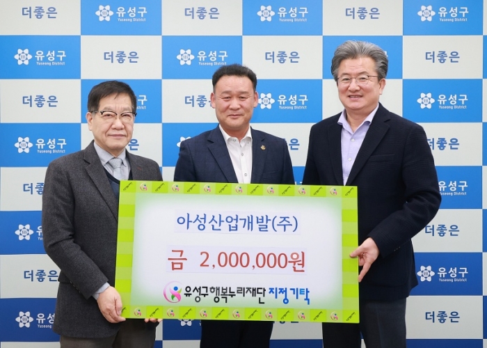 [시사코리아저널=이선우 기자] 대전 유성구(구청장 정용래)는 25일 아성산업개발(주)(대표 현민우)이 관내 저소득층을 위한 후원금 200만 원을 유성구행복누리재단에 지정 기탁했다고 밝혔다.