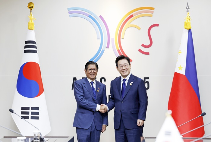 | 이재명 대통령과 페르디난드 마르코스 필리핀 대통령이 지난해 10월 31일 APEC 정상회의장인 경북 경주화백컨벤션센터에서 정상회담 전 기념촬영하고 있다. /연합뉴스 자료사진 |