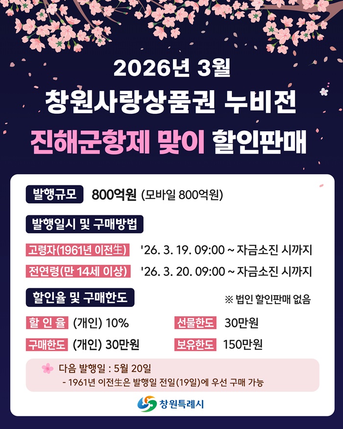 심동섭 경제일자리국장은 “군항제 특수가 음식·숙박·카페·전통시장 등 지역 상권 전반으로 확산될 수 있도록 발행 규모를 늘렸다”며 “시민과 관광객이 누비전을 적극 활용해 지역경제에 활력을 불어넣는 계기가 되길 기대한다”고 밝혔다.