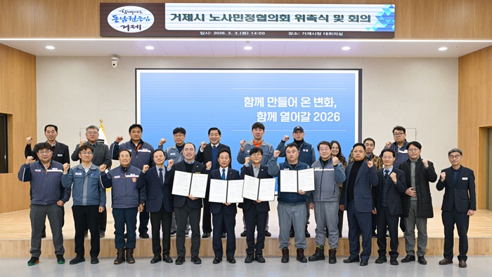 [시사코리아저널=정종민 선임기자] 거제시(시장 변광용)는 3일 거제시청 대회의실에서 '2026년 제1회 노사민정협의회'를 개최하고, ‘안전한 일터․기후회복력 강화 공동선언문’을 채택했다.