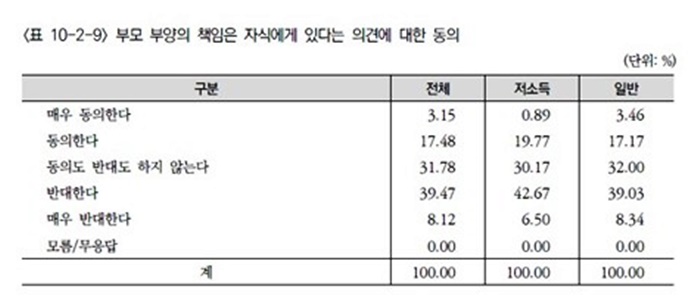 저소득 가구원의 찬성 비율은 20.66%였고 일반 가구원의 찬성 비율은 20.63%로 사실상 차이가 없었다. 반대 비율 역시 저소득 가구 49.17%, 일반 가구 47.37%로 사회 전 계층에서 부모 부양을 자녀의 전적인 몫으로 보지 않는 기조가 뚜렷했다.