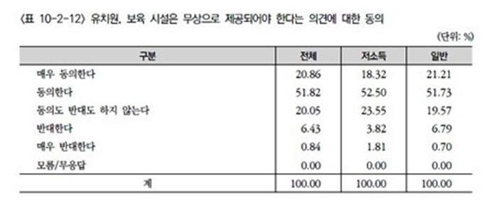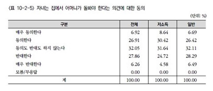 다만 이 문항에서는 소득 계층별로 미세한 시각 차이가 존재했다. 저소득 가구원 중에서는 어머니의 직접 돌봄에 찬성하는 비중이 39.06%로 일반 가구원의 33.11%보다 다소 높게 나타났다.