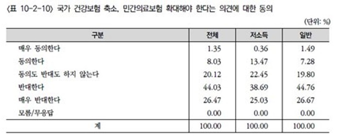 하지만 의료와 기초 보육만큼은 계층을 불문하고 국가가 확실히 책임져야 한다는 공감대가 압도적이었다. 국가 건강보험을 축소하고 민간 의료보험을 확대해야 한다는 의견에 대해서는 국민 10명 중 7명인 70.50%가 반대했다. 찬성 의견은 9.38%에 불과했다.