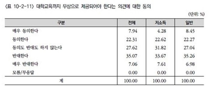 대학 무상 교육에 반대한다는 응답은 42.13%로 찬성 의견인 30.25%보다 높았다.