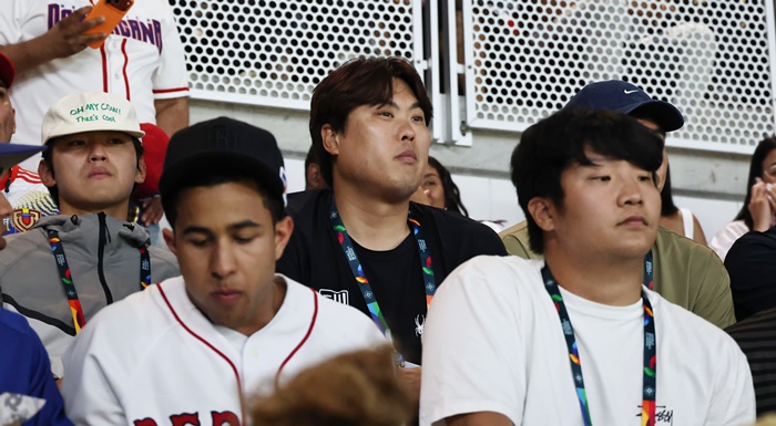 | WBC 한국 야구대표팀의 문보경과 류현진이 11일(현지시간) 미국 플로리다주 마이애미 론디포파크에서 열린 2026 월드베이스볼클래식(WBC) D조 도미니카와 베네수엘라의 경기를 지켜보고 있다. /연합뉴스 |