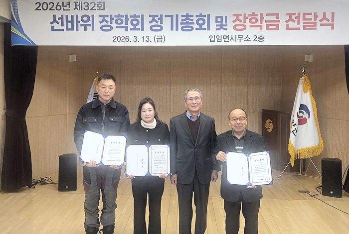 이날 선바위장학회는 입암면 출신 대학생 3명에게 각 100만원의 장학금을 전달하며 새로운 학교생활을 격려했다.