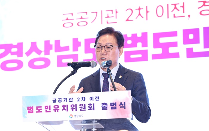 | 박완수 경남지사가 공공기관 2차이전 범도민유치위원회 출범식에서 당위성을 피력하고 있다. |