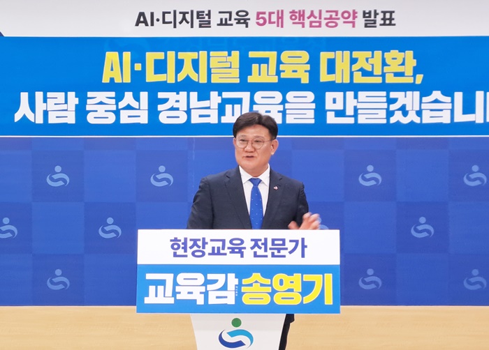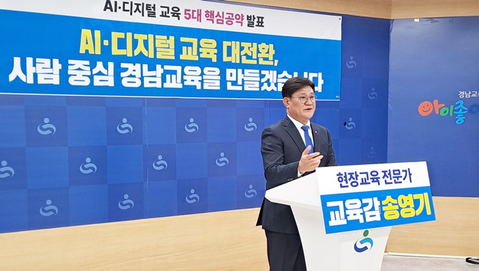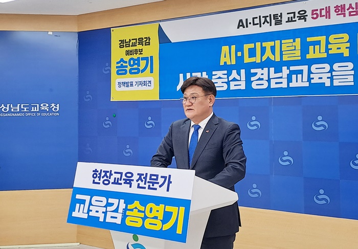 [시사코리아저널=정종민 선임기자] 송영기 경남교육감 예비후보는 17일 오전 도교육청 브리핑룸에서 기자회견을 열고 'AI·디지털 교육 대전환, 사람을 중심에 둔 경남교육'을 핵심 기조로 하는 AI·디지털 교육 5대 공약을 발표했다.