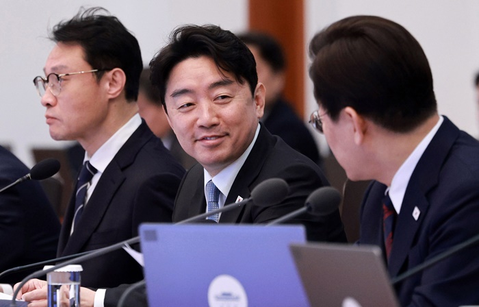 | 강훈식 비서실장이 19일 청와대에서 열린 수석보좌관회의에서 아랍에미리트(UAE) 특사 방문과 관련해 이재명 대통령의 격려 발언을 듣고 있다. /청와대통신사진기자단 |