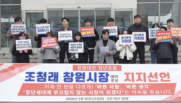 [시사코리아저널=이환수 기자] 오는 6.3 지방선거를 앞두고 창원 지역 청년들의 새로운 목소리를 대변하는 ‘창원대안 청년포럼(대표 원대연)’이 조청래 창원시장 예비후보에 대한 공식 지지를 선언했다.