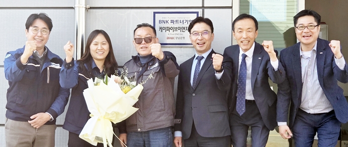 한편 임재문 부행장은 케이파이브이앤지㈜ 본사를 방문해 김장호 대표와 BNK 파트너기업 현판식을 가졌다.
