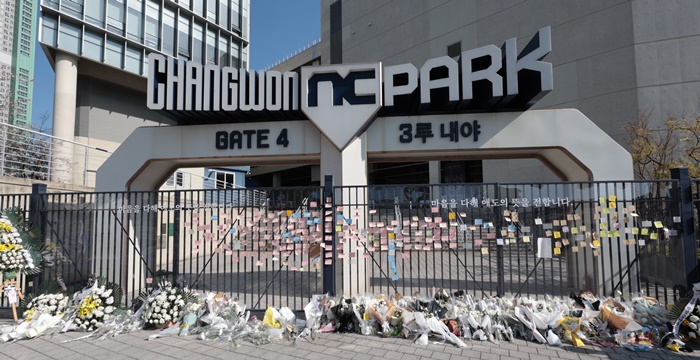| 지난해 4월 8일 오후 경남 창원시 마산회원구 창원NC파크 3루 쪽 내야 입구에 추모 메시지가 붙어있다. /연합뉴스 자료사진 |