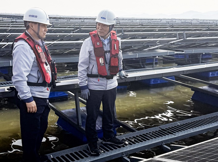 | 조영혁 사장직무대행이 수상태양광 안전점검을 하고 있다. /남동발전 제공 |
