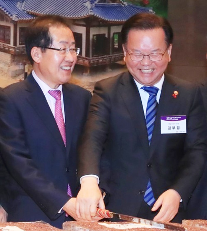 | 자유한국당 홍준표 대표(왼쪽)와 김부겸 행정안전부 장관이 지난 2018년 1월 8일 오후 서울 태평로 한국프레스센터에서 열린 재경 대구-경북인 신년교례회에서 함께 칼을 잡고 축하떡을 자르며 미소짓고 있다. /연합뉴스 자료사진 |
