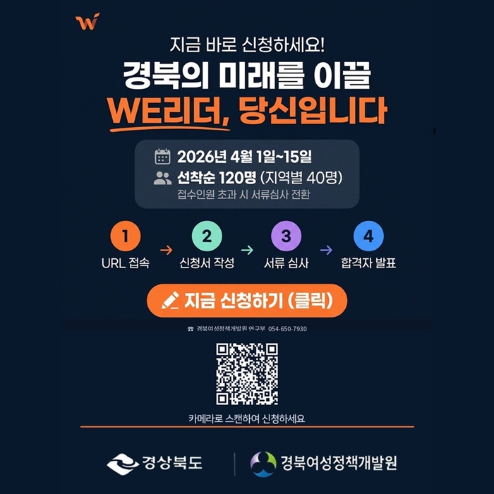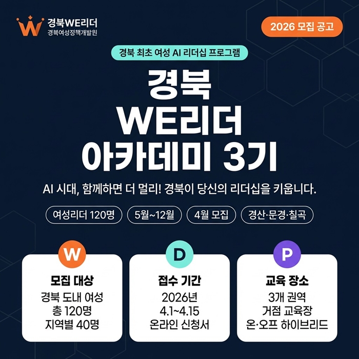 [시사코리아저널=김연학 기자] 경북도와 경북여성정책개발원은 지역사회와 함께 성장하고 싶은 여성리더를 대상으로‘경북 WE리더 아카데미 3기’참가자를 4월 1일부터 4월 15일까지 모집한다.