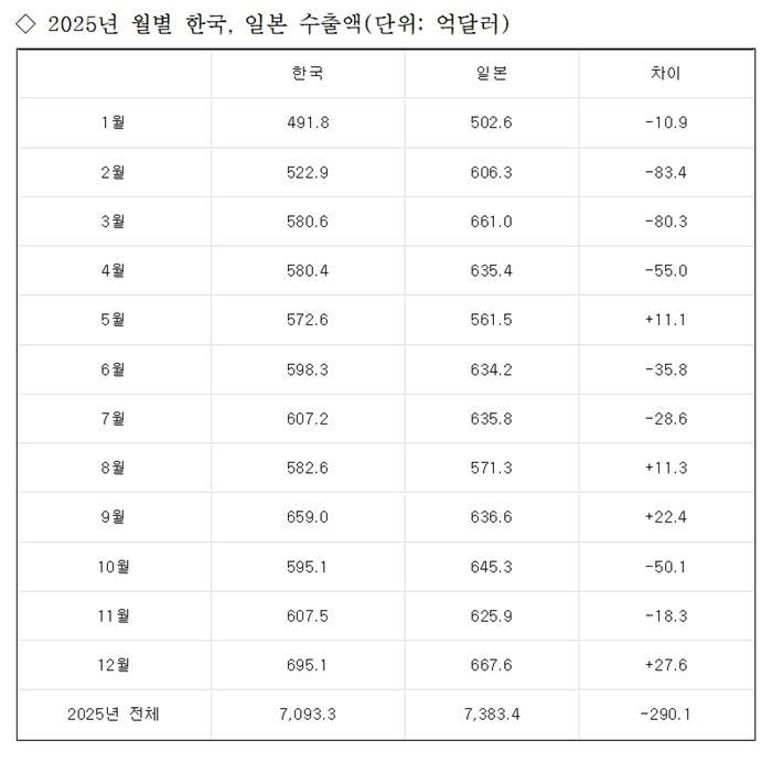 작년 하반기 누적 수출액 기준으로는 한국이 3천746억5천만달러, 일본이 3천782억5천만달러를 기록하며 격차가 크게 줄었다.
