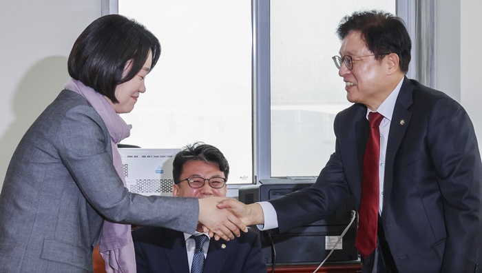 | 국회 예산결산위원회 더불어민주당 간사인 이소영 의원(왼쪽), 국민의힘 간사인 박형수 의원(오른쪽)이 27일 국회에서 중동 사태 대응을 위한 추가경정 예산안 협의를 위해 진성준 위원장 주재로 만나 악수하고 있다. /연합뉴스 |
