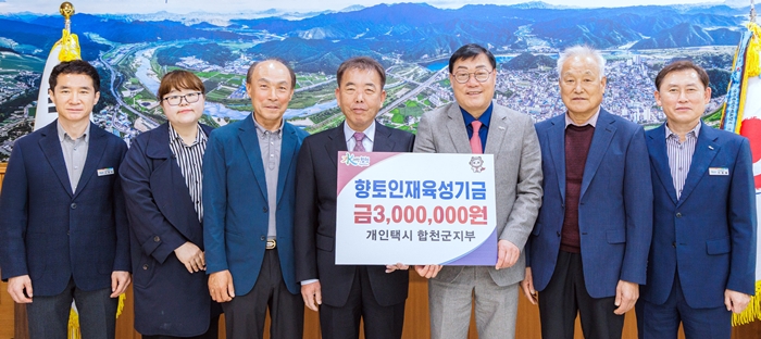 [시사코리아저널=정종민 선임기자] 개인택시 합천군지부(지부장 이홍인)는 6일 (재)합천군인재육성재단(이사장 김윤철)을 방문해 향토인재육성기금 300만원을 기탁했다.