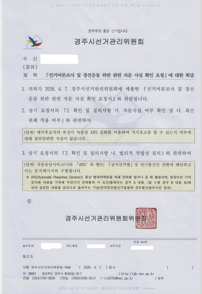 ◈ 선관위는 주낙영 후보 주장의 사실 관계에 대해 즉각 답변 촉구