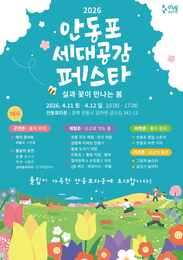 안동포타운 관계자는 “이번 안동포세대공감페스타는 안동포의 전통 직조 문화와 자연, 체험이 어우러진 행사로 전 세대가 전통의 의미를 공감할 수 있도록 풍성하게 준비했다”며, “튤립이 만개한 안동포타운에서 전통의 멋과 봄의 활력을 동시에 만끽하시길 바란다”고 전했다.